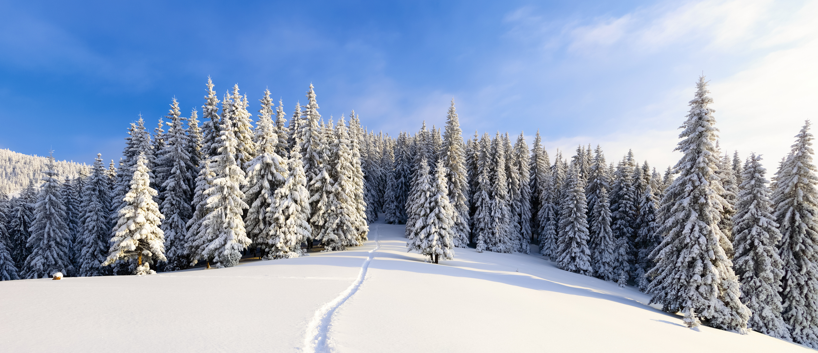 On a frosty beautiful day among high mountains and peaks are magical trees covered with white fluffy snow against the magical winter landscape.